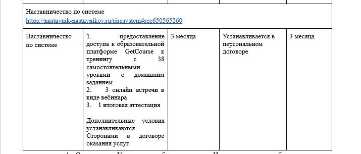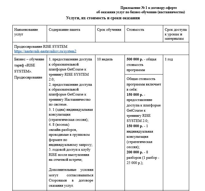 2.4. Стоимость, перечень, содержание, сроки, место и порядок оказания Услуг указаны на сайте Исполнителя https://centr-nastavnichestva.ru/ ,https://nastavnik-nastavnikov.ru/, а также его поддоменах (далее – Сайт) и/или в Приложении № 1. Оказание услуг по каждому последующему Курсу осуществляется на основании данного Договора-оферты при первом акцепте Договора-оферты, Заказчик акцептует Договор на определенный срок в соответствии с выбранным форматом доступа.