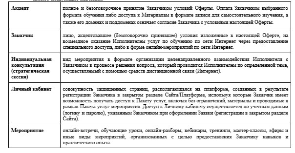 В случае принятия изложенных ниже условий и оплаты услуг, лицо, производящее акцепт этой оферты, становится Заказчиком. В связи с вышеизложенным, внимательно прочитайте текст данной оферты и, если вы не согласны с каким-либо пунктом оферты, Исполнитель предлагает вам отказаться от каких-либо действий, необходимых для акцепта или заключить персональный договор на отдельно обсуждаемых с Исполнителем условиях.