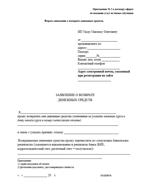 7.7. Обязательные пункты заявления на возврат денежных средств: