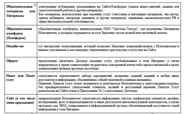 Все остальные термины и определения, встречающиеся в тексте настоящего Договора, толкуются Сторонами в соответствии с действующим законодательством Российской Федерации и сложившимися в сети Интернет обычными правилами толкования соответствующих терминов.