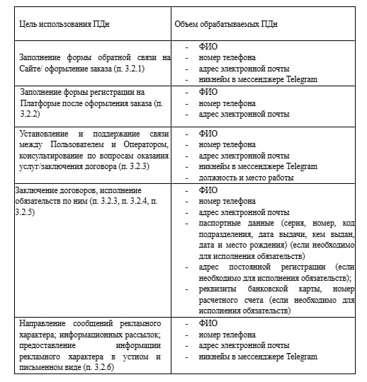 3.2.3. Для надлежащего исполнения договора возмездного оказания услуг Оператором, в том числе установления с Субъектом обратной связи, включая направление уведомлений (в том числе с помощью социальных сетей/мессенджеров), запросов, касающихся использования Сайта/Платформы, обработку запросов и заявок от Субъекта, консультирование по оказанию услуг/заключению договора.